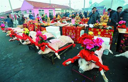 大肥豬抬到海邊,大鱸魚、紅公雞和餑餑等供品擺上方桌,隨著數百掛鞭炮一齊鳴響,具有500多年歷史的祭海儀式拉開序幕。昨天上午,即墨田橫祭海儀式在黃龍莊海邊舉行,3萬多名各地游客擠進小漁村,感受古老祭海民俗文化的魅力。今天上午,周戈莊將上演更大規模的祭海盛典。 數百掛鞭炮一齊鳴響 “大肥豬還披著紅衣服。”昨天一大早,記者在田橫鎮黃龍莊海邊看到,船老大們趕在太陽躍出海平面前,紛紛將披著大紅花、穿著紅衣服的大肥豬抬到海邊,又將大鱸魚、紅公雞和香餑餑等供品擺在一張方形桌子上,隨著數百掛鞭炮一齊鳴響,漁民開始燒紙祭海。 一名船老大告訴記者,供品擺上后,每名漁民都要在龍王前跪拜,以表虔誠,大肥豬等供品要在海邊擺到中午以后才能抬走。有些家里有小漁船的漁民,都會提前準備一個大豬頭,擺放在家里的供桌上。而用來祭海的大肥豬,船老大會分給漁民一起享用。 養參戶也開始祭海了 “養參戶也開始祭海了。”黃龍莊漁民楊乃錫告訴記者,他前幾年就不出海了,上岸搞起了養參業,每年祭海時,他也跟船老大一樣,殺頭大肥豬祭海,祈求風調雨順、年年豐收。田橫鎮政府工作人員介紹,這幾年,出海捕魚的少了,上岸搞養殖的多了,但不管是出海捕撈,還是上岸養殖,祭海都是一樣,這個漁家民俗不會丟掉。 祭海儀式的舉行,讓黃龍莊一下熱鬧起來,涌入了大量游客。在特色小吃一條街上,許多游客一邊吃著冰糖葫蘆等小吃,一邊欣賞古老的祭海儀式。有的漁民坐在自家船上,悠閑自在地欣賞戲曲。 一名來自新疆的游客告訴記者,他前幾天來青島看朋友,這是第一次看到祭海的場景,他用手機將全程拍了下來,回到新疆后要讓家鄉的朋友看個新鮮。 |