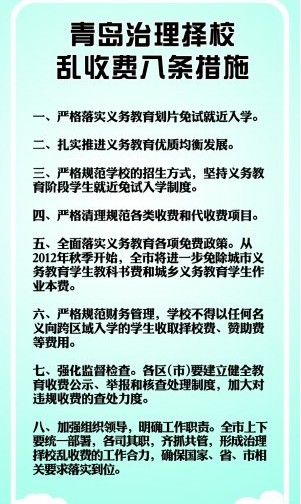 公辦學校要劃片免試就近入學,禁止學校舉辦重點班,擇校生要先經過公證,有條件學校采用電腦搖號招收擇校學生,禁止收取任何名目的擇校費……在教育部、山東省教育廳相繼出臺治理擇校亂收費的文件后,8月9日,青島市教育局聯合有關部門結合青島實際,出臺了青島版的八條義務教育階段擇校亂收費治理措施。