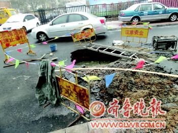 ????“這個(gè)坑很危險(xiǎn),早上有輛車開(kāi)到這里,還差點(diǎn)掉下去。”附近的一位居民說(shuō),幸好那名司機(jī)反應(yīng)快。其實(shí)13日下午這里就已有小小的塌陷,但不是很嚴(yán)重,沒(méi)想到過(guò)了一夜,路面竟發(fā)生了大面積的塌陷。