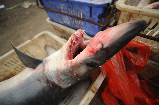 由于場面血腥引起了不少市民圍觀猜測,不少圍觀者覺得,鯊魚應該屬于保護動物,不能隨便捕撈食用。(記者張力偉攝)
