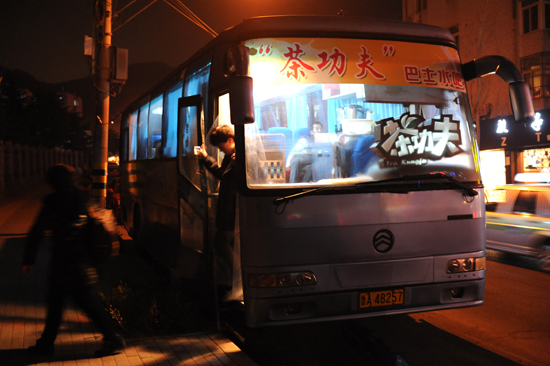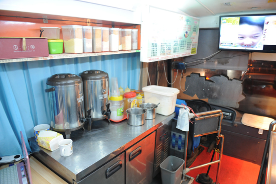 記者看到,車頭的擋風玻璃上貼有“茶功夫巴士水吧”的招牌。走上巴士,發現車里面完全是按照餐廳的風格裝修一新。原先車頭的駕駛室變成了小廚房,而車上原先的座椅都被一排排餐桌取代。車廂雖然狹小,卻擺放了電腦、電視、音響、空調等設備。店主閆先生告訴記者,用巴士做餐廳比路邊的大排檔干凈衛生得多,而且還特別有情調。
