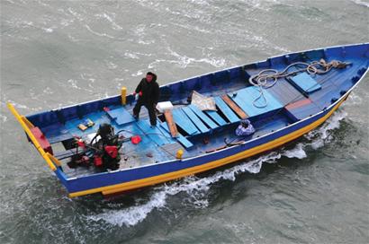5分鐘后,海面上的一個小黑點出現在搜救人員視線中,通過望遠鏡,搜救人員確定小黑點就是小舢板,船體長約10米。