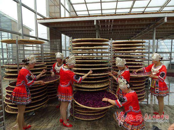 ▲工作人員身著少數(shù)民族傳統(tǒng)服飾在晾曬處理玫瑰花。