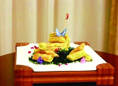 鍋塌是魯菜的一種傳統(tǒng)技法,由于制作稍顯麻煩,很多酒店不太愿意做。四流南路的柒號院飯店還秉承著老的傳統(tǒng)制作工藝。柒號院的廚師長楊明翟介紹,白菜葉開水稍燙,抹上蝦泥修成方形,拖蛋液入鍋內(nèi)煎成兩面金黃,加高湯小火燜至湯汁濃稠即可食用。
