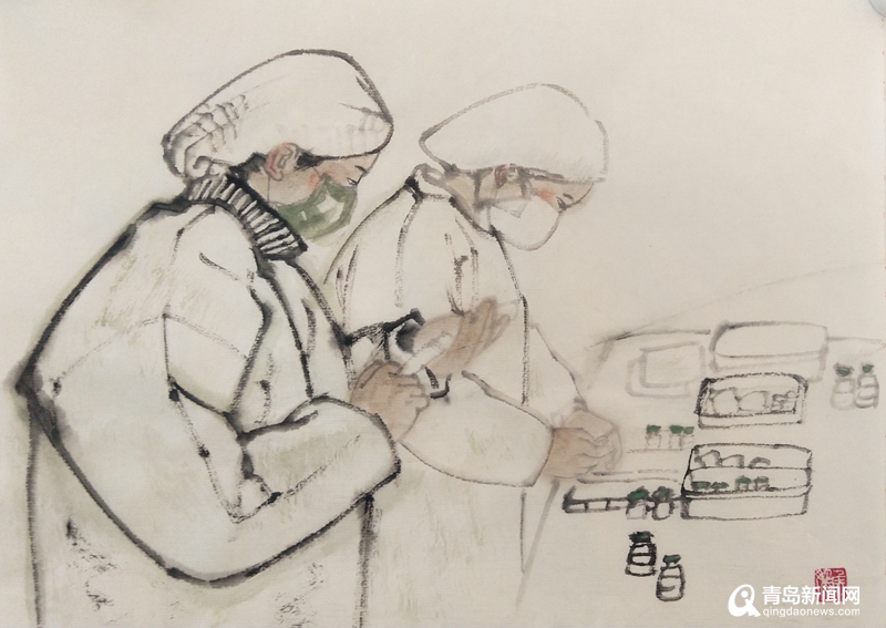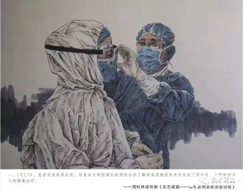 青島畫院的書畫家們用自己的畫筆描繪醫務人員奔赴一線、馳援武漢,社會各界捐款捐物、大愛無疆,人民群眾同心協力、守望相助,基層干部值班值守、排查服務等美術作品,集中呈現出這個特殊時期的精神圖譜。