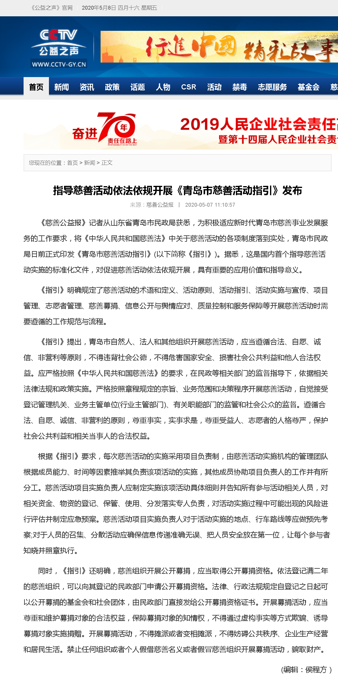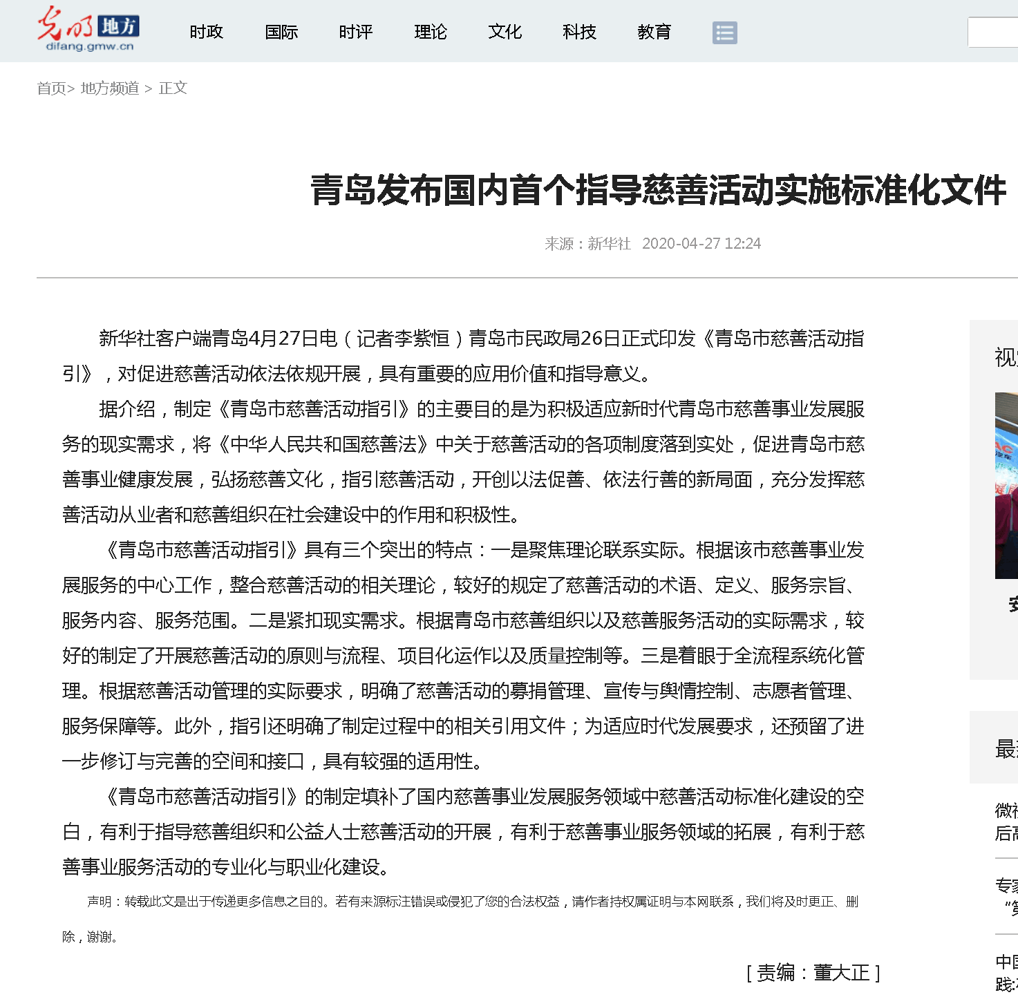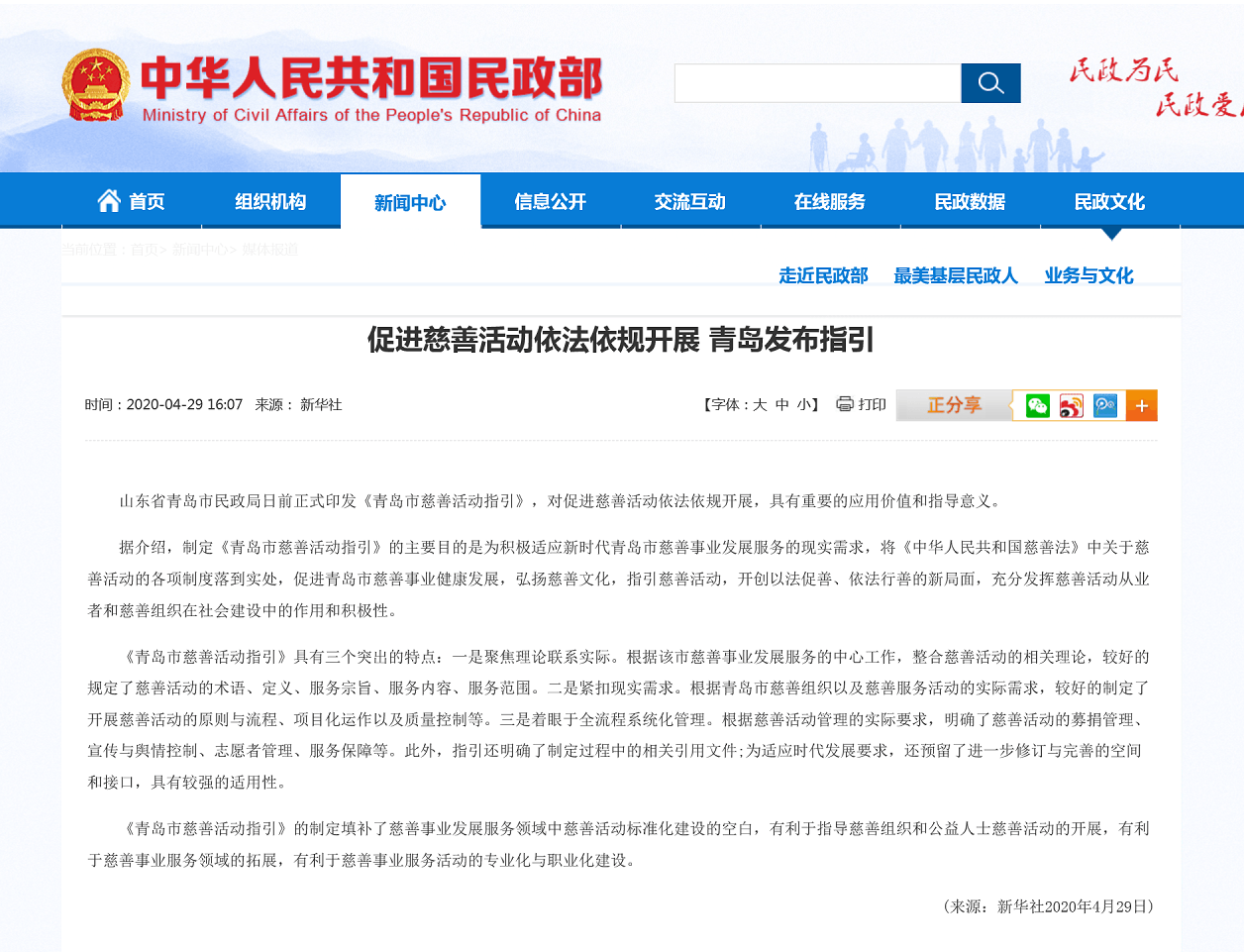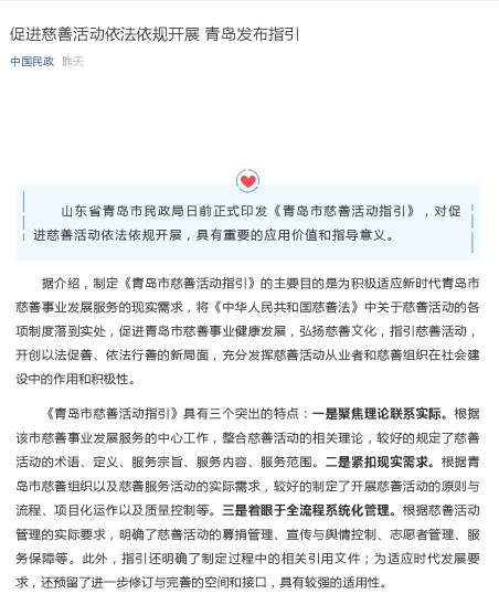 該《指引》的出臺得到了新華社、人民日報海外網、人民論壇網、 CCTV公益之聲官網、國家民政部官網、中國民政微信公眾號、光明網、齊魯網等 30余家媒體和網站的關注宣傳,對推動我市慈善工作起到了積極作用。