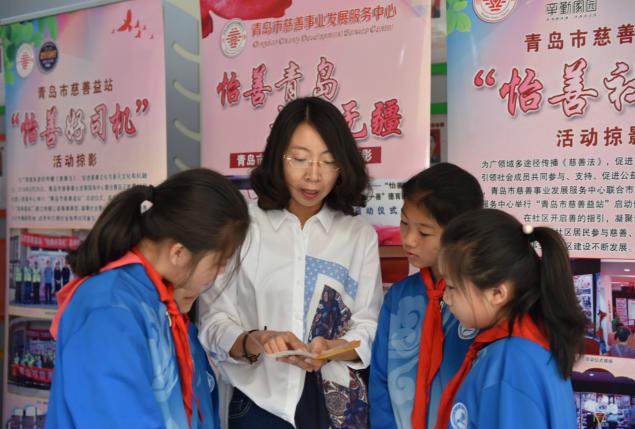 青島市慈善事業(yè)發(fā)展服務(wù)中心工作人員向小學(xué)生發(fā)放《慈善法》宣傳折頁(yè)