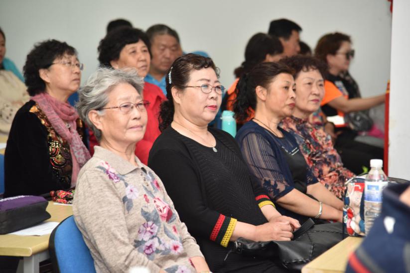 “怡善講堂”活動(dòng)現(xiàn)場(chǎng),全體人員共同觀看《青島慈善之歌》MV