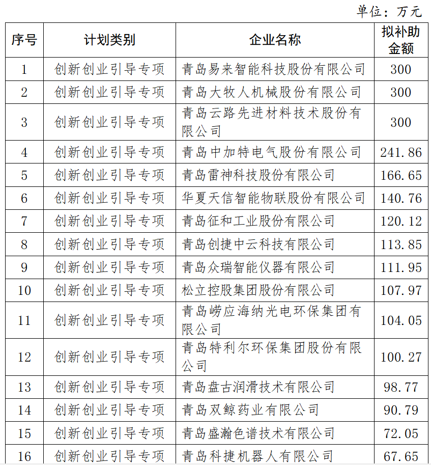 日前,青島市科技局公示了2021年青島市科技計劃創新創業引導專項高新技術企業上市培育庫入庫企業研發投入獎勵擬補助企業名單,共有36家企業有機會獲得補助,補助總額為3230.29萬元。